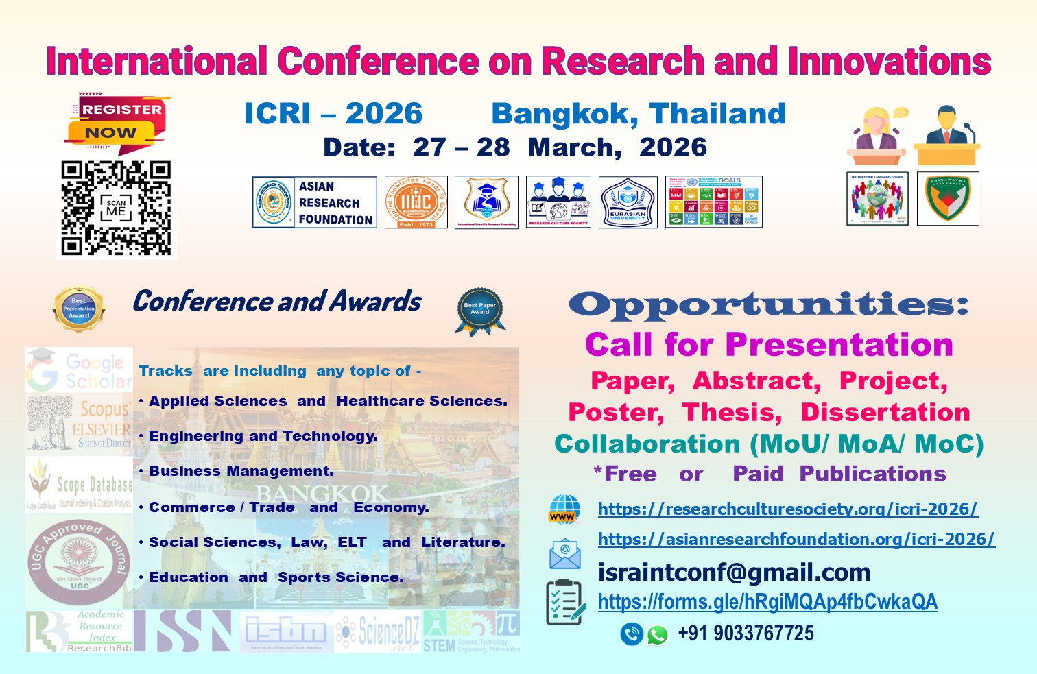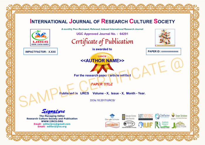 INTERNATIONAL JOURNAL OF RESEARCH CULTURE SOCIETY (IJRCS) is a UGC Approved Journal, Peer-Reviewed, Scholarly Scientific International Journal, Monthly Open Access Journal. IJRCS is indexed in Google Scholar, ResearchBib, ResearcherID, ESJI, ZDB, EZB, SCOPE Database, POL Index, Academia, ASI, SJIF, SLI, ISIFI, ISSUU, ROAD and also indexed in UGC Approved List of Journals.:
